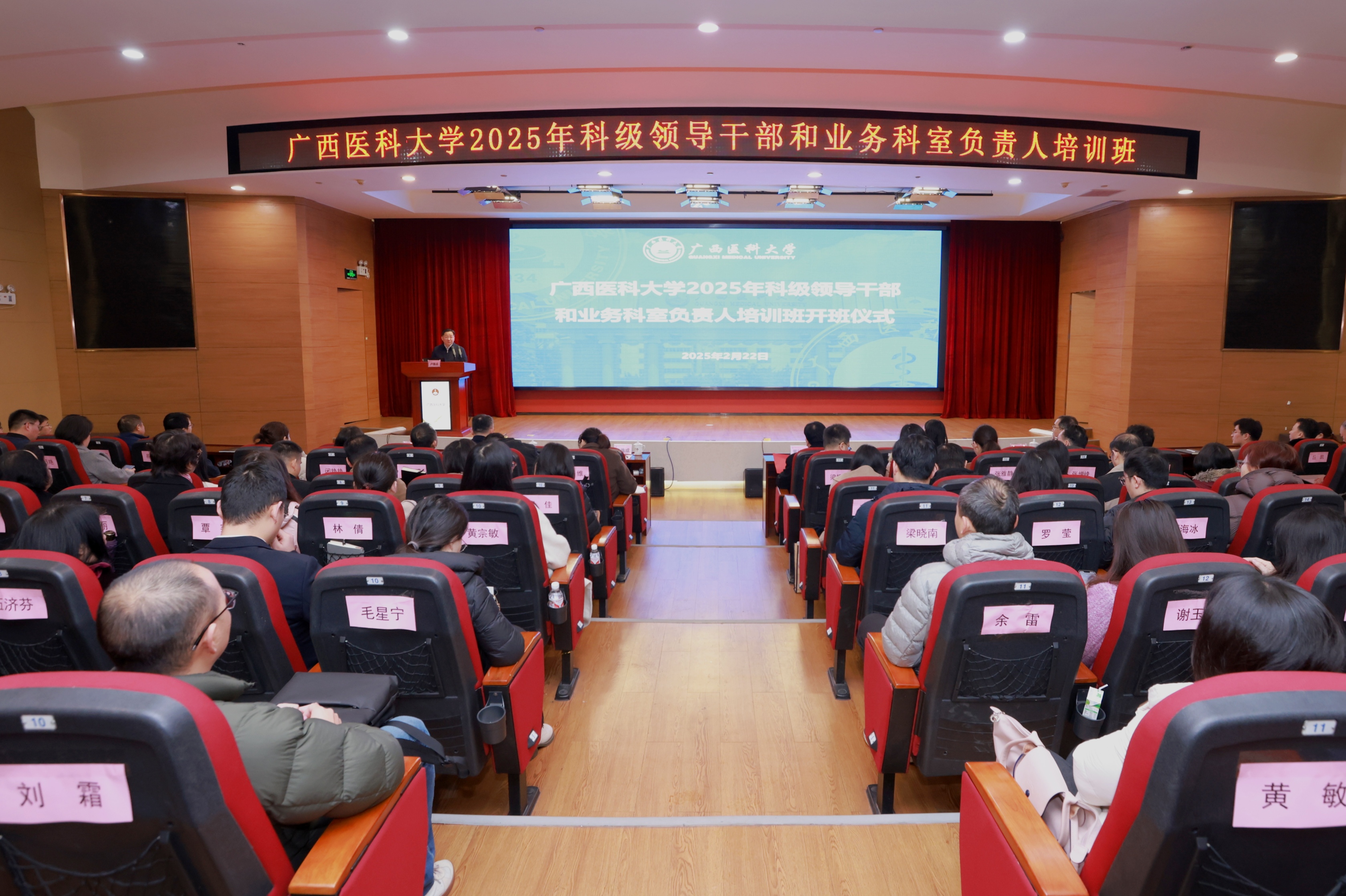 为深入学习贯彻党的二十届三中全会精神,进一步提升我校干部队伍综合素质与履职能力,2月22日-23日,学校利用开学前周末两天时间在校本部科技楼报告厅举办2025年科级领导干部和业务科室负责人培训班,校本部科级领导干部、业务科室主任及各直属附属医院相关党政科室负责人参加培训。学校党委书记黄照权作开班讲话,校长曾志羽作专题授课,副校长卢德成主持开班仪式。
