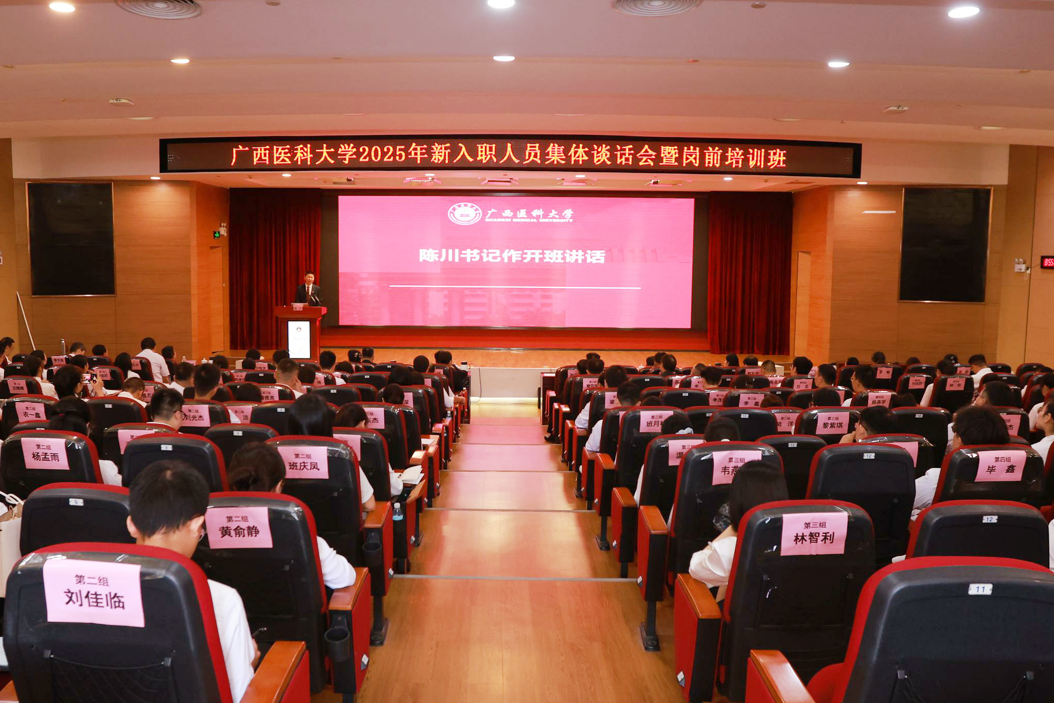 为深入贯彻落实立德树人根本任务,加强新时代高素质专业化教师队伍建设,9月15日上午,beats365(中国区)-唯一官方网站2025年87名新入职人员集体谈话会暨岗前培训班在南宁-校本部科技楼报告厅举行。校党委书记陈川、校长曾志羽出席开班仪式。开班仪式由副校长卢德成主持。